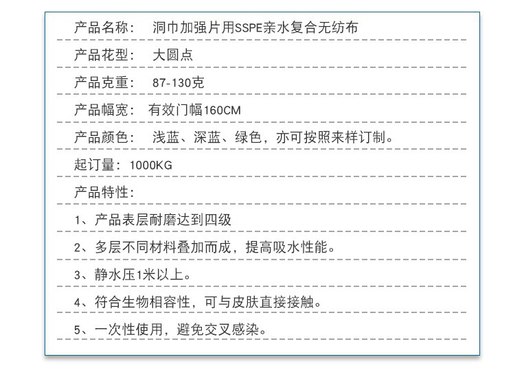 產品摘要:品質標準 中國紡織行業標準(FZ) 主要成分 pp聚丙烯 幅寬 有效門幅165cm 克重 30-80克(g/㎡) 成網方式 熔噴 主要用途 醫療衛生用布,家居家紡用布,收納、包裝用布 貨號