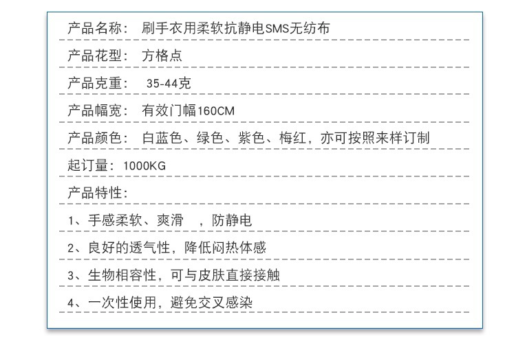 產品摘要:品質標準 中國紡織行業標準(FZ) 主要成分 無紡布 幅寬 有效門幅160cm 克重 35-44克(g/㎡) 成網方式 紡絲 主要用途 醫療衛生用布,家居家紡用布,收納、包裝用布 貨號 21 成分及